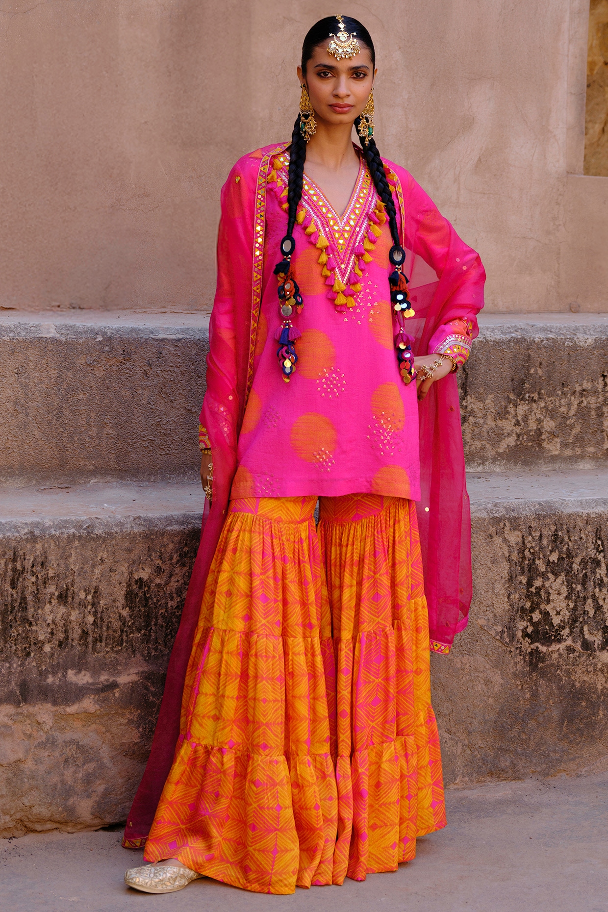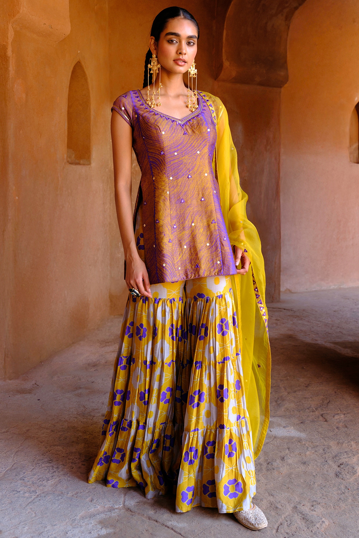 Wide-leg, flared pants with a short kurta and dupatta. Lucknawi origin, now a staple for sangeet and festive events. From designers like Seema Gujral and Rimple & Harpreet Narula to labels like Libas and Kalki.