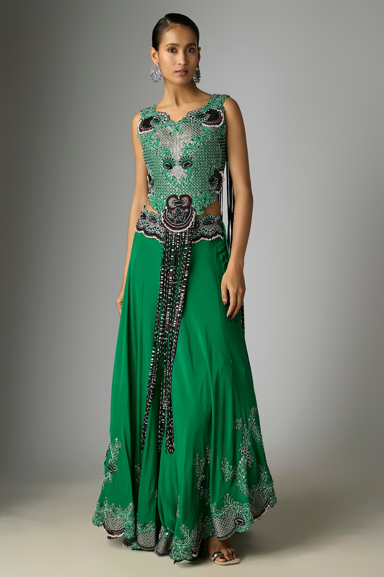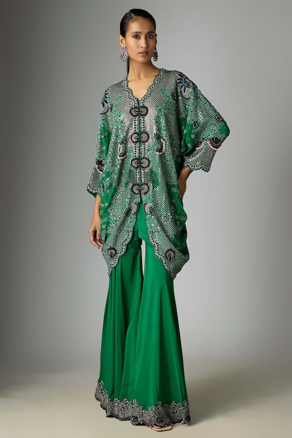 Wide-leg, flared Indian pants — fitted at the waist, flaring from the knee or thigh. Worn with a short kurta and dupatta. Originated in Lucknow, now one of the most popular outfits for sangeet and festive events.