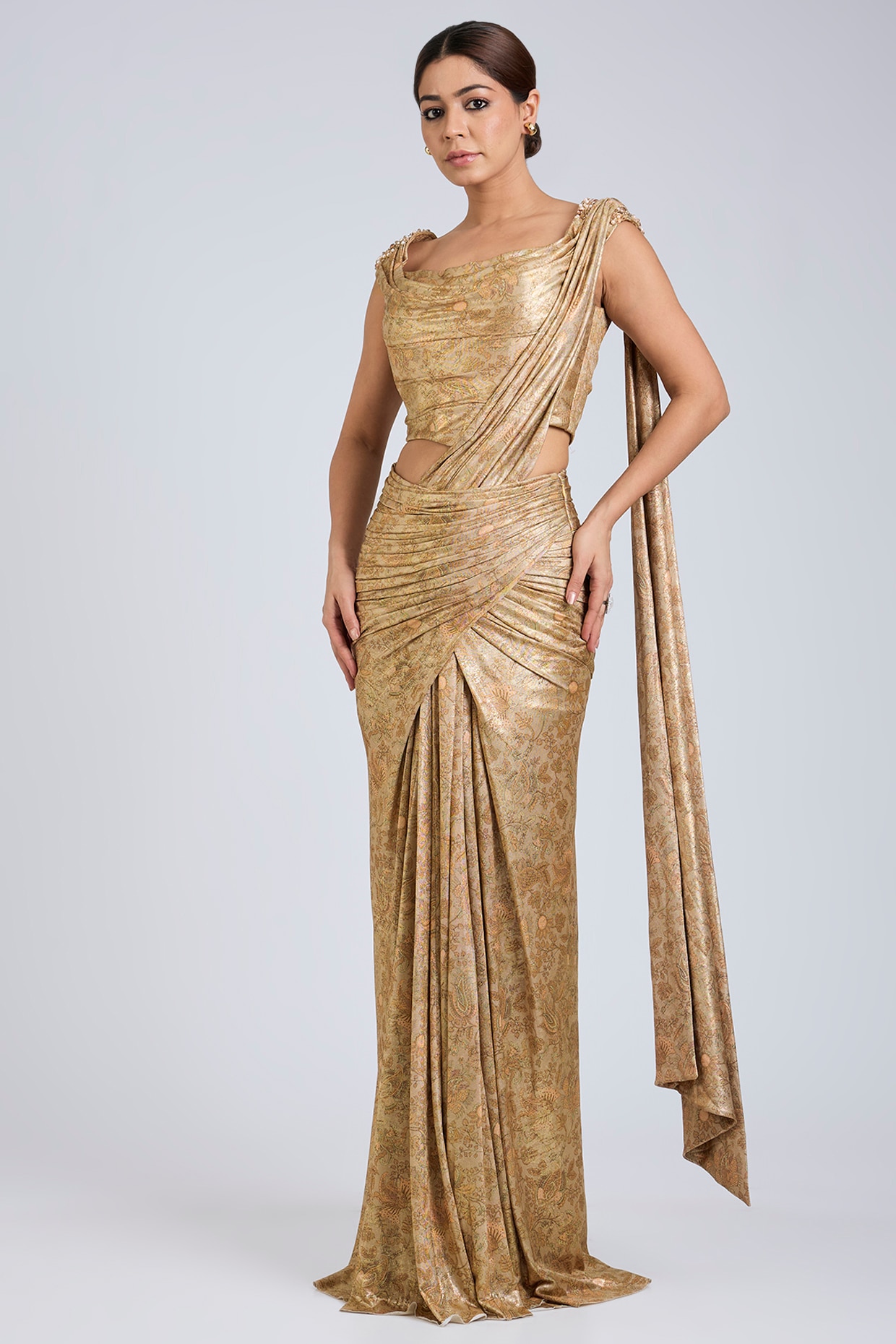 Tarun Tahiliani Beige Gold Foil Jersey Printed Concept Saree Set
