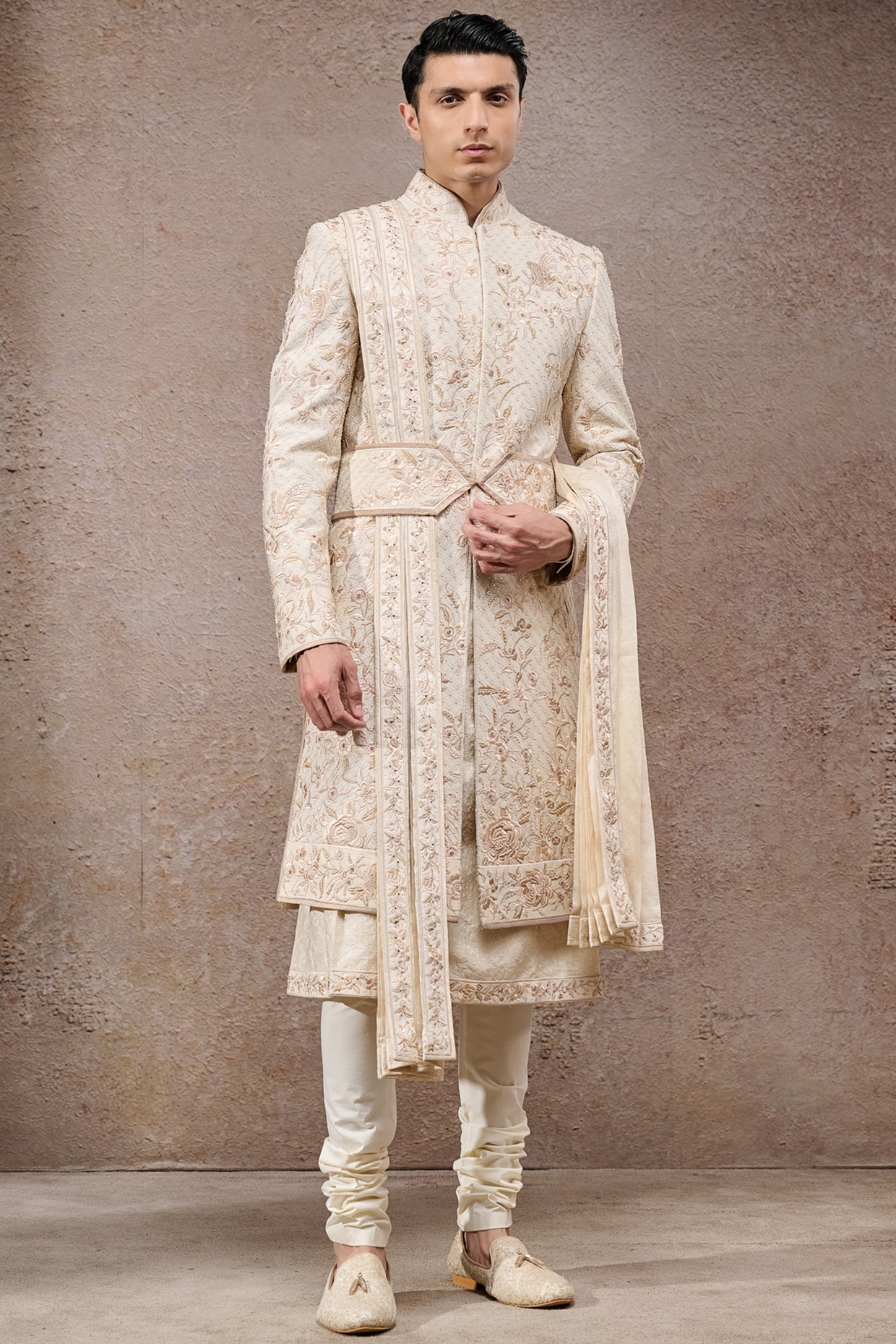 Tarun Tahiliani Ivory Tissue Satin Thread Embroidered Sherwani Set