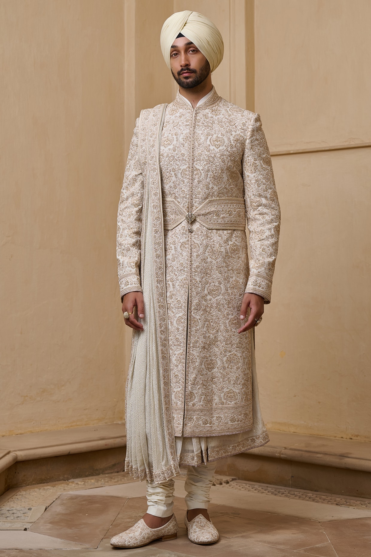 Tarun Tahiliani Ivory Georgette Zari Thread & Pearl Embellished Sherwani Set