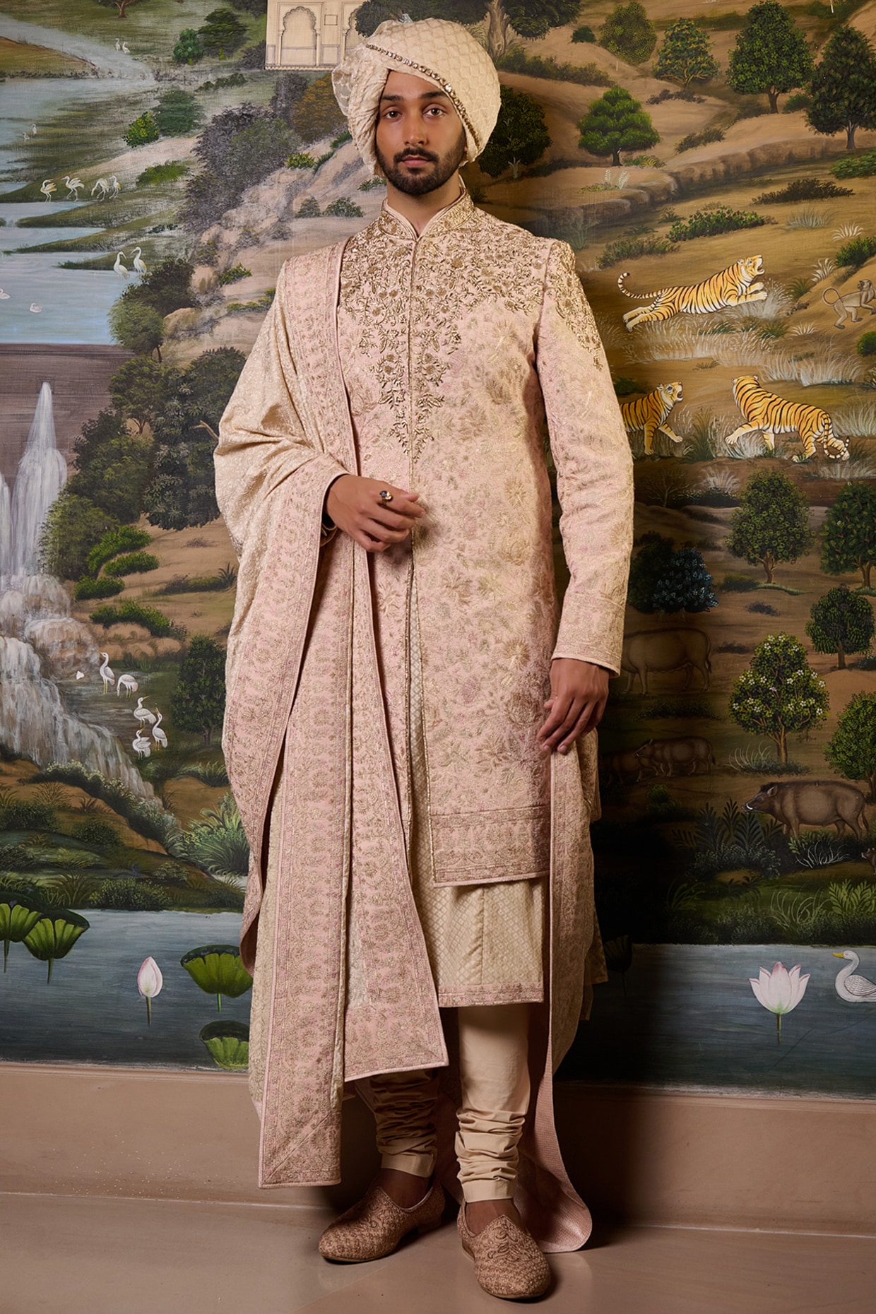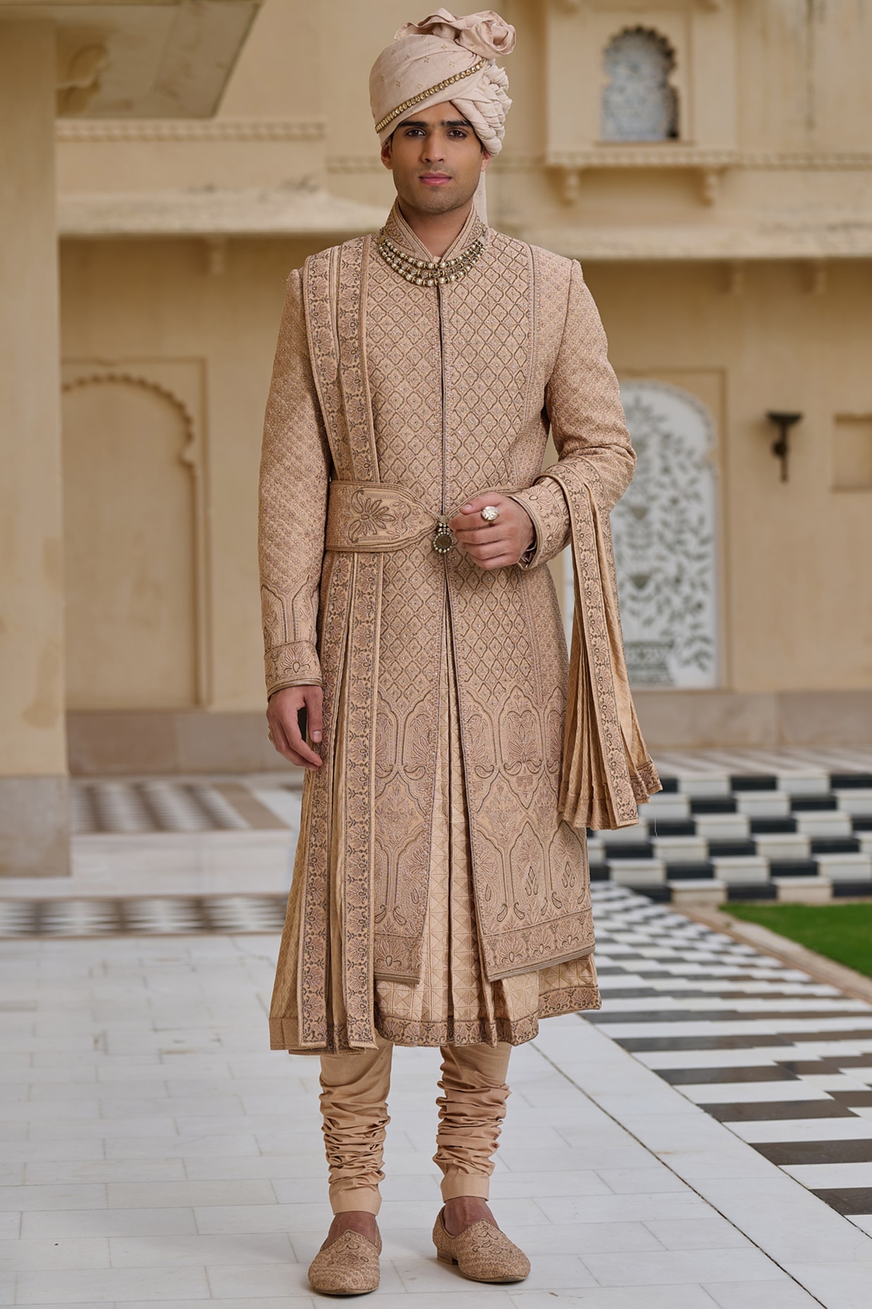Tarun Tahiliani Salmon Pink Georgette Zari & Thread Embroidered Sherwani Set