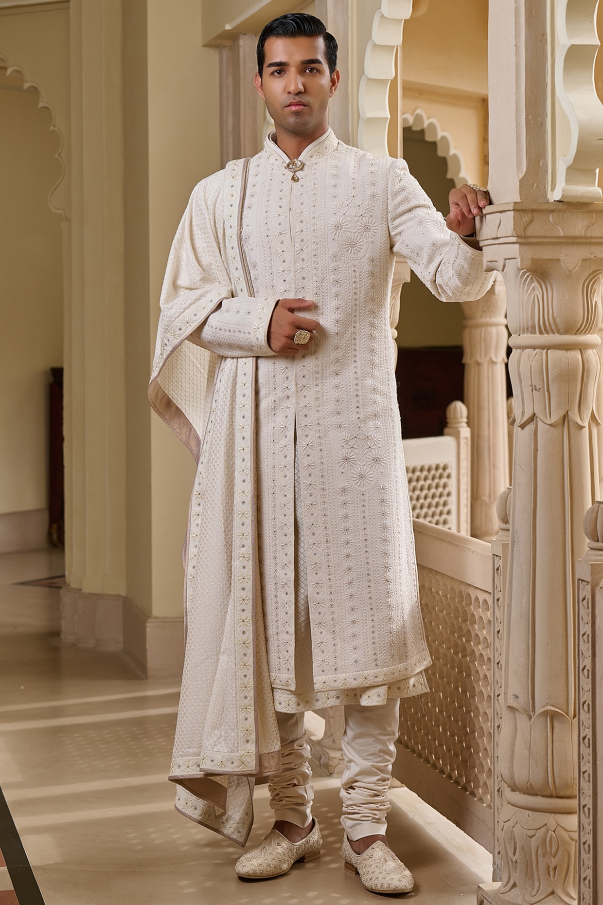Tarun Tahiliani Ivory Georgette Chikankari & Diamond Embroidered Sherwani Set
