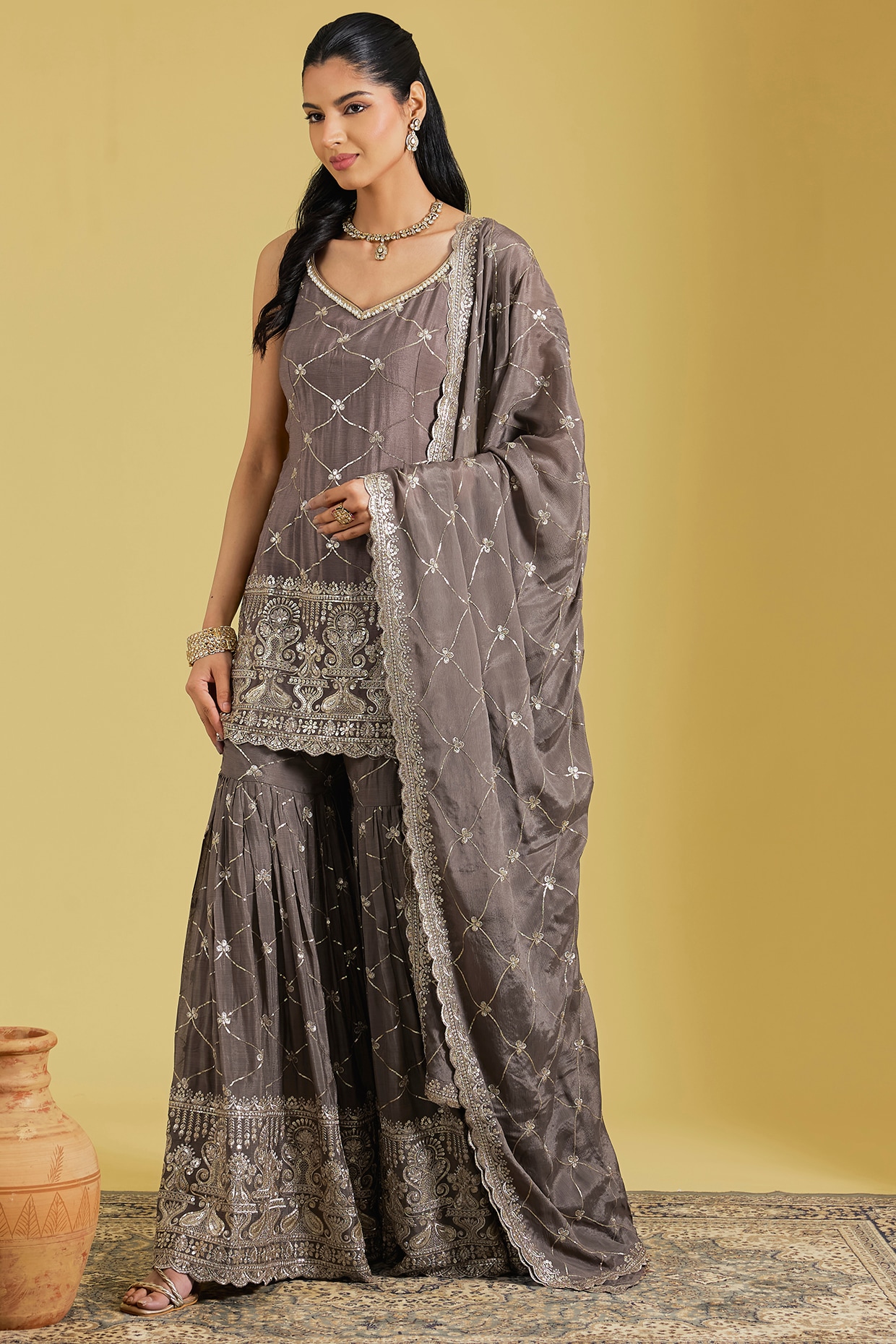 MeenaGurnam Mouse-Colored Georgette Embroidered Gharara Set