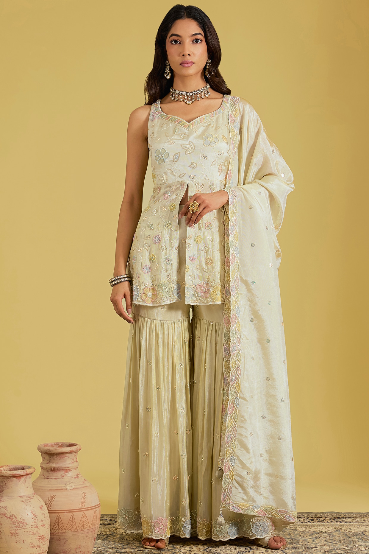 MeenaGurnam Gold Tissue Embroidered Gharara Set