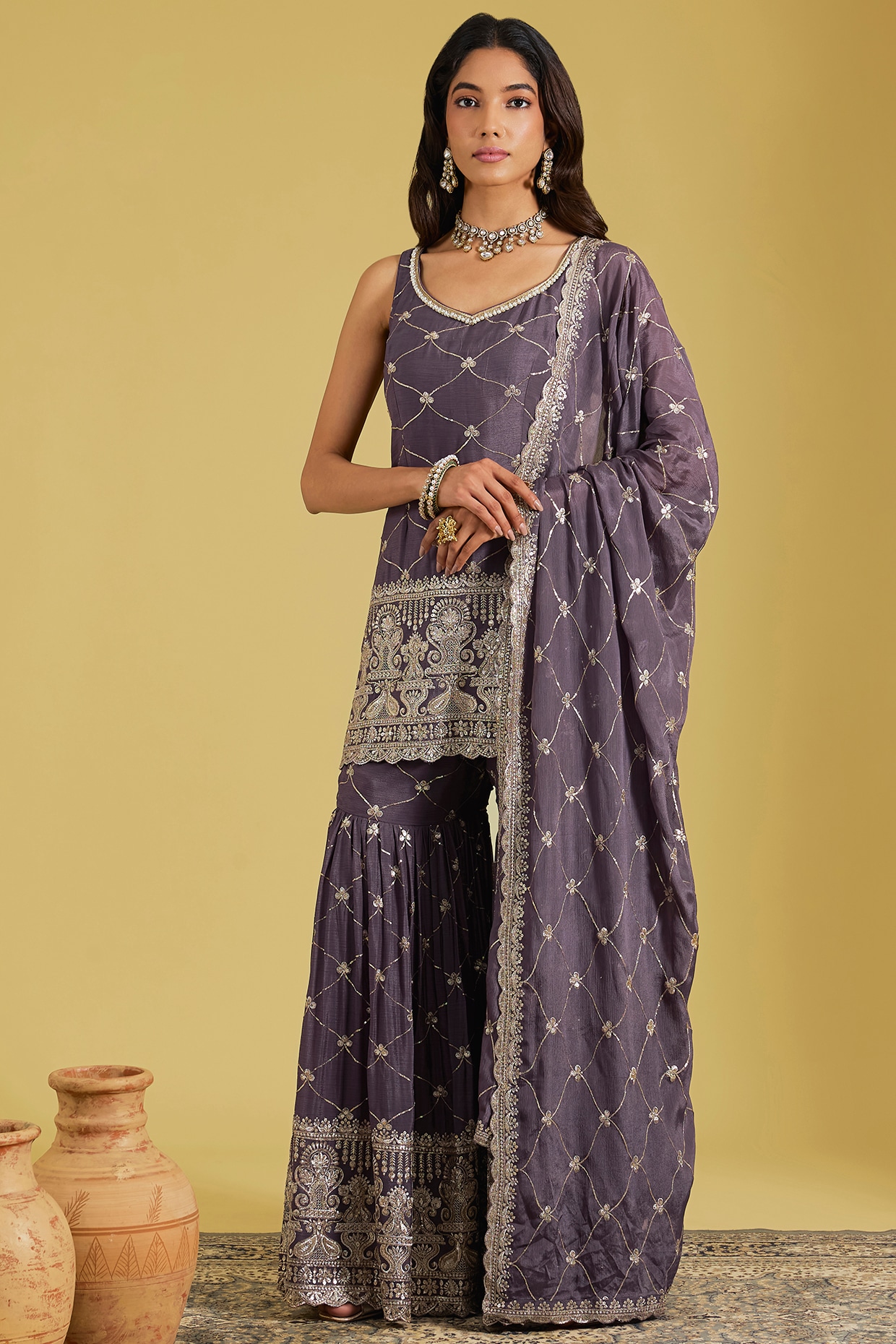 MeenaGurnam Purple Chinon Embroidered Gharara Set