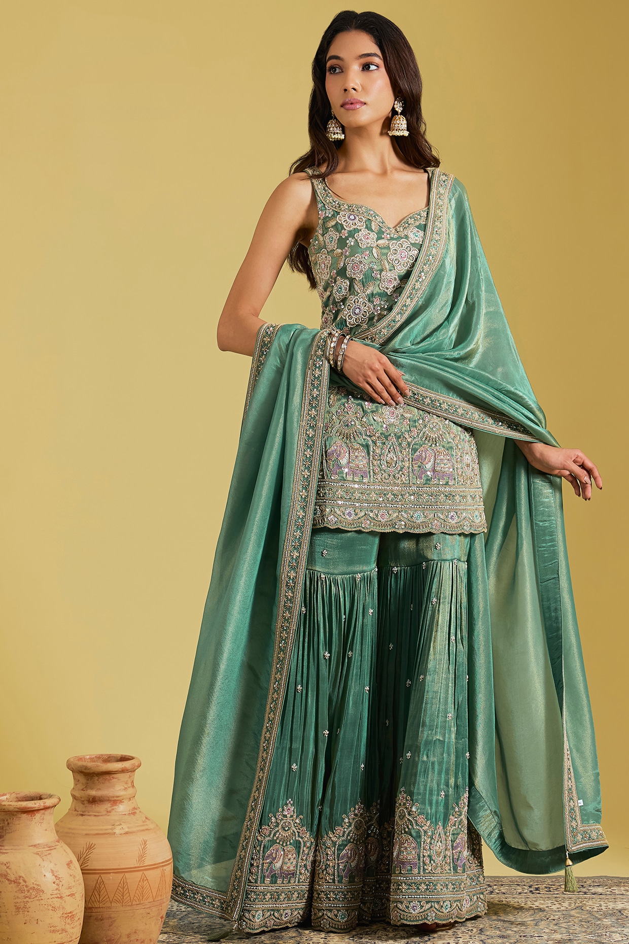 MeenaGurnam Green Tissue Embroidered Gharara Set